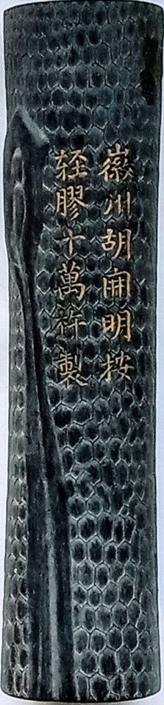 註十 明 文彭 〈徽州吳君得妙法製墨賦詩贈之〉:「新安松枝燒不絶,紅霞碧焰相糾結。收烟調搗三萬杵,練作玄霜烏玉玦。設来几案對端侯,雲浮烟散光澄澈。落紙三年不昏暗,一㸃霜紈漆無别。廷珪巳矣潘谷死,此道只今誰得比。水晶宮客汪廷器,吳郎繼之真二美。時時贈我兩三丸,光黒異常心獨喜。日日用之無間㫁,經嵗方能半寸毁。黄金可得柰墨無,莫輕目前惟重耳。嗟余不欲磨世人,願得一笑臨池水。」